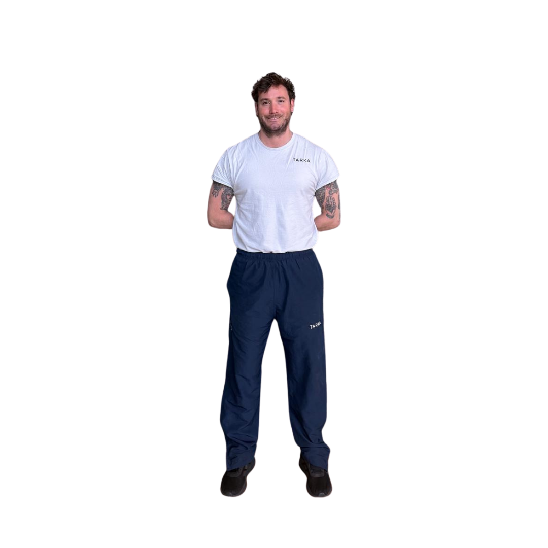The Official TARKA Tracksuit Bottoms. Built for leading active sessions. Designed in navy blue, these tracksuit bottoms feature the TARKA logo on the left thigh and Akuma branding down the right leg. Complete with an adjustable drawstring waist and zip ankles, they are perfect for quick changes over trainers and all-day comfort.